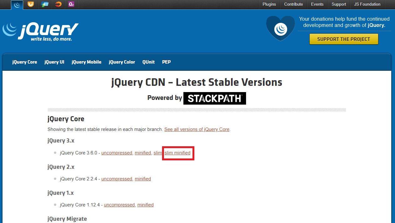 Google에서 jQuery CDN을 검색한 다음 jquery 사이트에서 가장 최신 버전 mifified를 눌러준다.