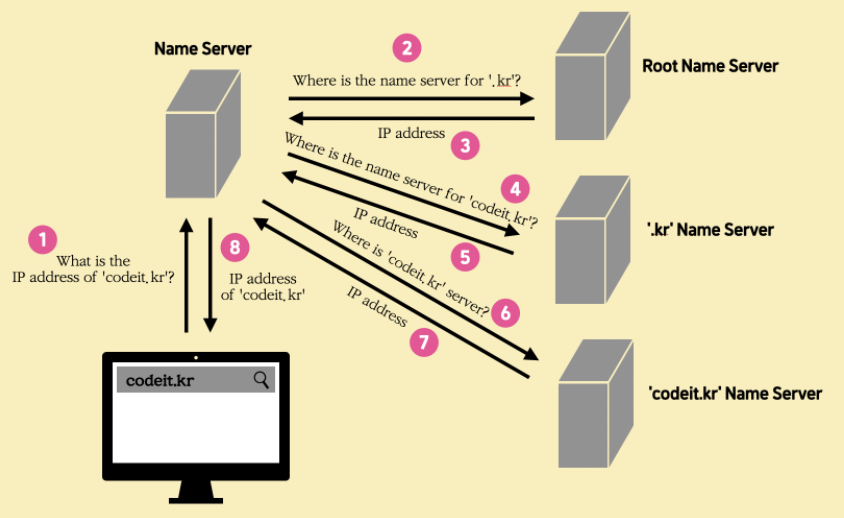 6, 7단계 : 그럼 네임 서버는 'codeit.kr' 네임 서버에게 'codeit.kr'의 IP 주소를 알려달라고 요청합니다. 마침내, 네임 서버는 'codeit.kr'의 실제 IP 주소를 응답으로 얻게 되죠.