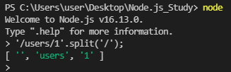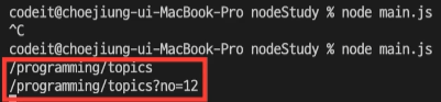 Node.js 의 teminal 창에서 입력한 주소 결과를 알 수 있다.