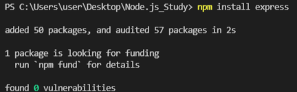 - npm : Node Package Manager 의 줄임말로 서드 파티 모듈을 설치할 때 사용하는 프로그램