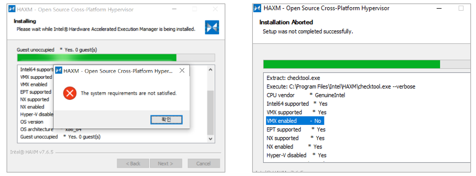 위 블로그를 참조하여 HAXM 다운로드 링크에서 HAXM을 다운받아 실행한 결과,