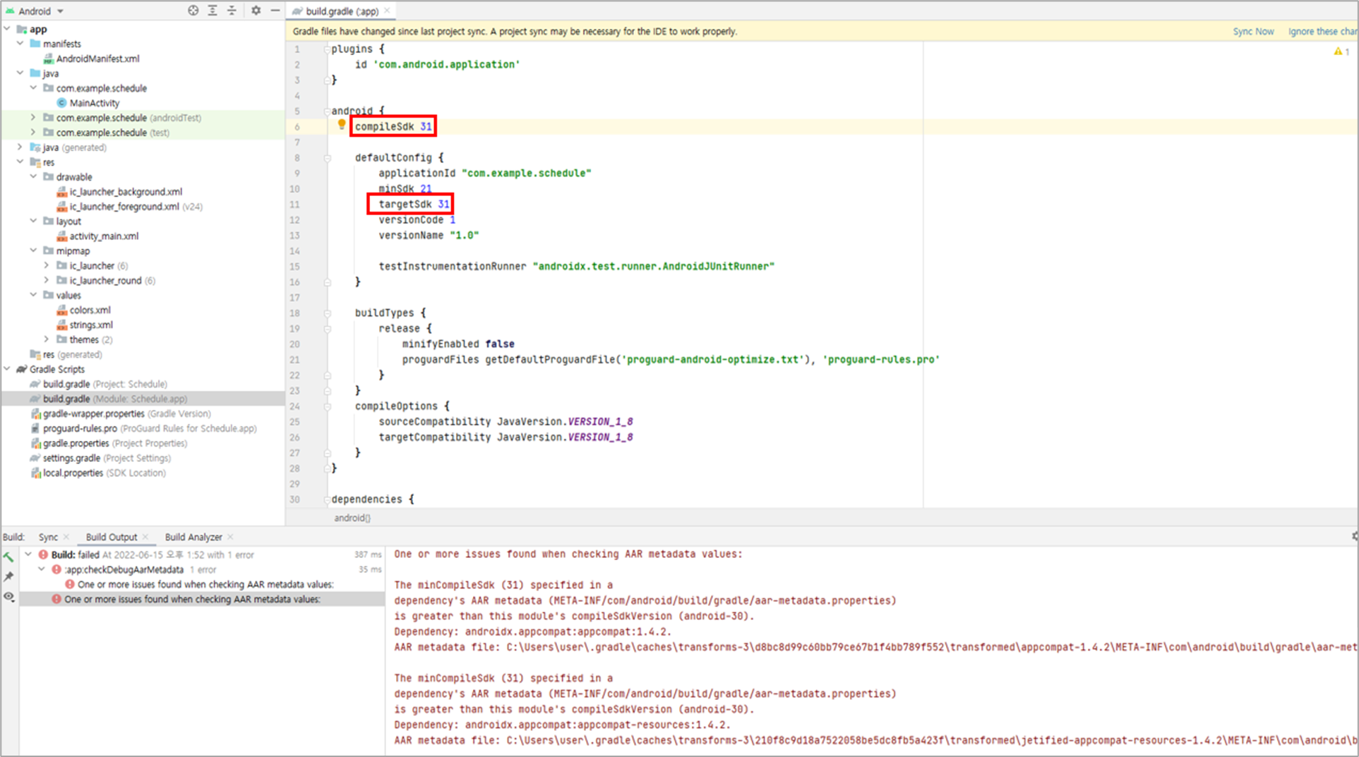 [안드로이드] 오류 해결 The minCompileSdk (31) specified in adependency's AAR metadata (META-INF/com/android/build/gradl