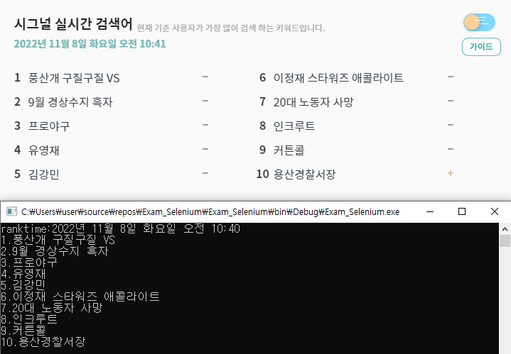 실행 후, 시그널 실시간 검색어사이트의 검색어를 크롤링한 결과를 확인할 수 있다.