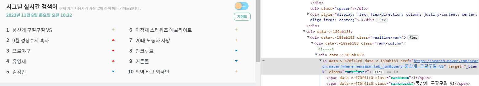 실시간 검색어를 조회해주는 사이트를 이용하여 10위까지 검색어를 추출하여 나타내고자한다.