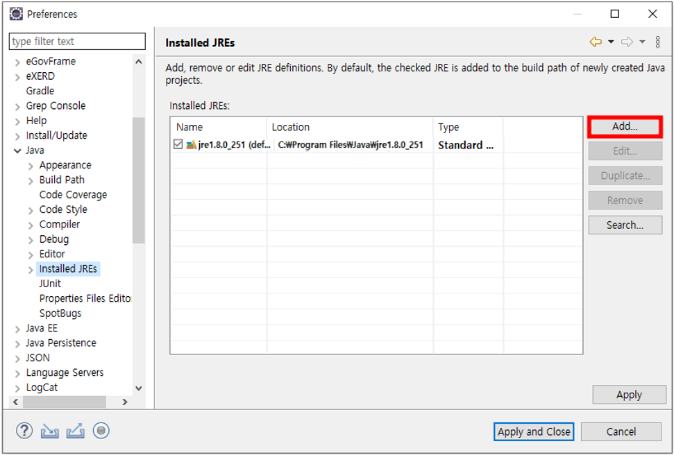 1) Installed JREs 설정